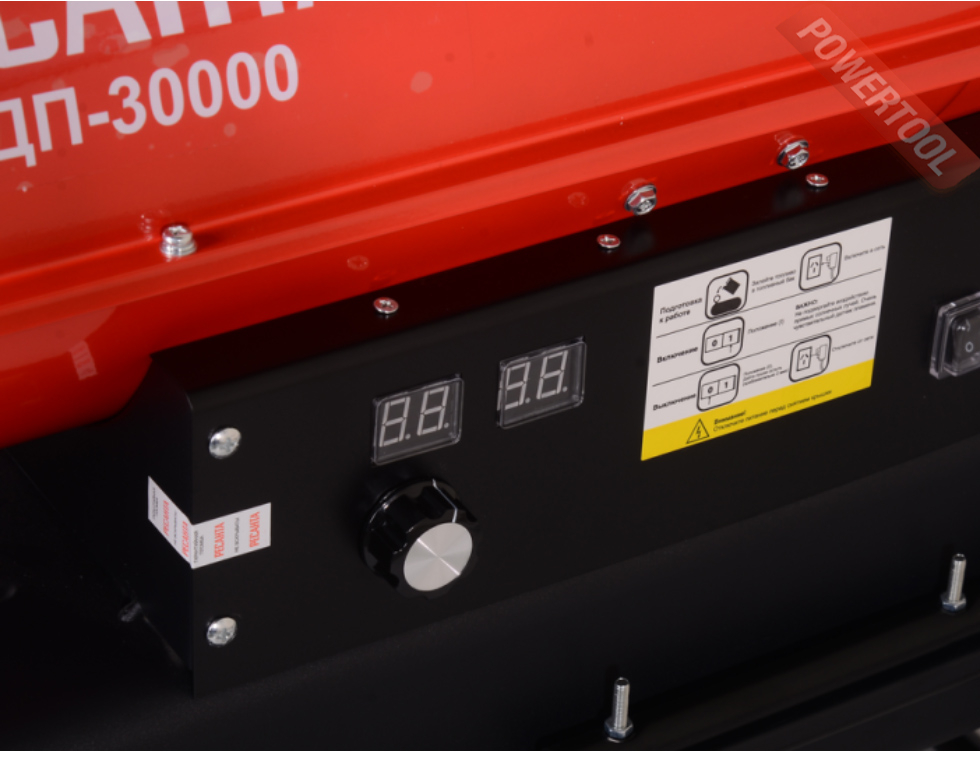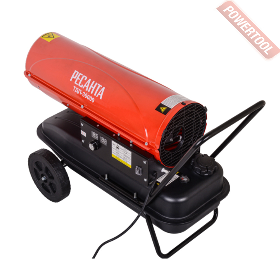 Дизельная тепловая пушка прямого нагрева РЕСАНТА ТДП-30000 может применяться на открытых или хорошо проветриваемых объектах, например, на строительных площадках, заводах, в складских помещениях. Предназначена для высокопроизводительного обогрева нежилых помещений, прогрева бетона или грунта при строительных и ремонтных работах. За короткое время может, обеспечить теплом большое пространство. Открытая камера сгорания выбрасывает вредные продукты вместе с горячим воздухом, поэтому применять в закрытых помещениях с людьми её нельзя. Перемещение и ввод в эксплуатацию не требует особых усилий и знаний. Запуск осуществляется нажатием одной кнопки, после продува системы происходит поджиг и дизельное топливо начинает равномерно сгорать в камере, а вентилятор создает воздушный поток и выдувает теплые массы в окружающее пространство. Уже на первой минуте работы жидкотопливного нагревателя, ощущается высокий КПД системы. Установка этой машины должна происходить в помещениях с возможностью проветривания, давая тем самым выход продуктам сгорания. Так как в технологии изготовления применен процесс прямого нагрева, то вместе с прогретым воздухом из сопла выходят элементы горения. Если нагнетательное давление сбалансировано и форсунка настроена правильно, то выхлопов минимальное количество, копать и темный дым отсутствуют.