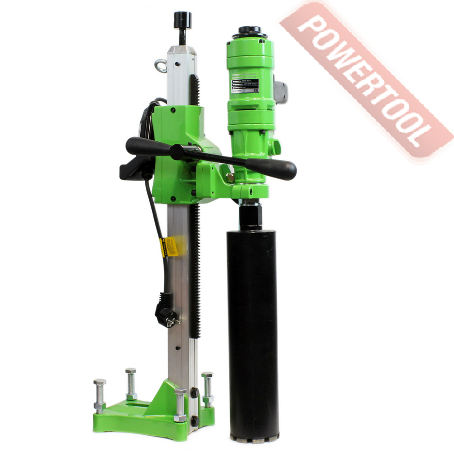 Дрель алмазного бурения, 1900 Вт, электрический двигатель 220 В, 2 скорости, 720-1230/720-1780 об/мин, max диаметр сверления 132 мм, резьба шпинделя 1 1/4 и 1/2 дюйма, М16, защита от перегрузки, плавный пуск.