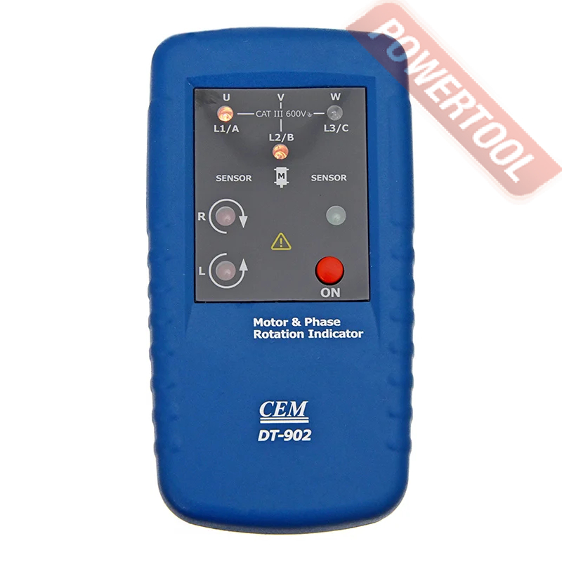 Для отображения результатов измерения указатель CEM DT-902 оснащен светодиодными индикаторами, размещенными на передней панели прибора: три из них указывают на наличие напряжения на соответствующей обмотке, два других определяют направление вращения двигателей (R или L). Номинальное напряжение работы прибора — от 120 В до 400 В. При этом указатель подаёт на фазу испытательный ток менее 3.5 мА. Питание прибора осуществляется от батарейки типа Крона.