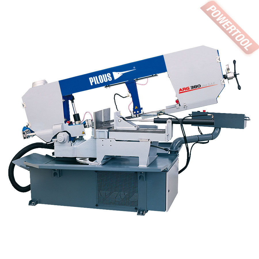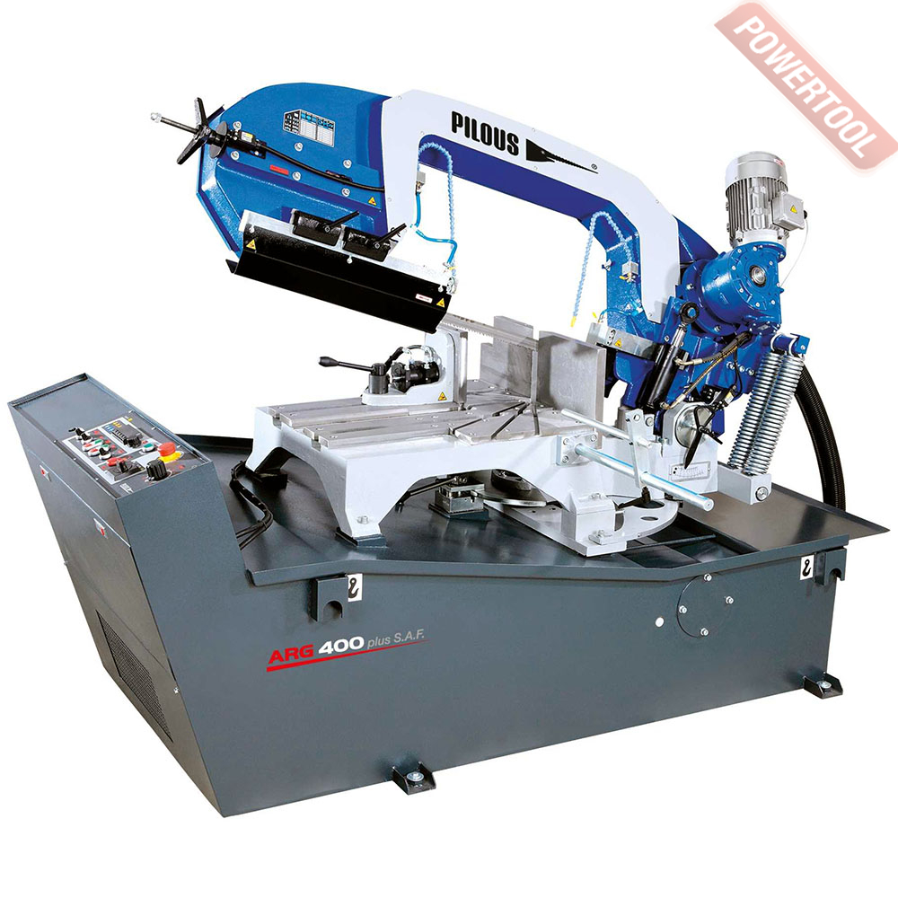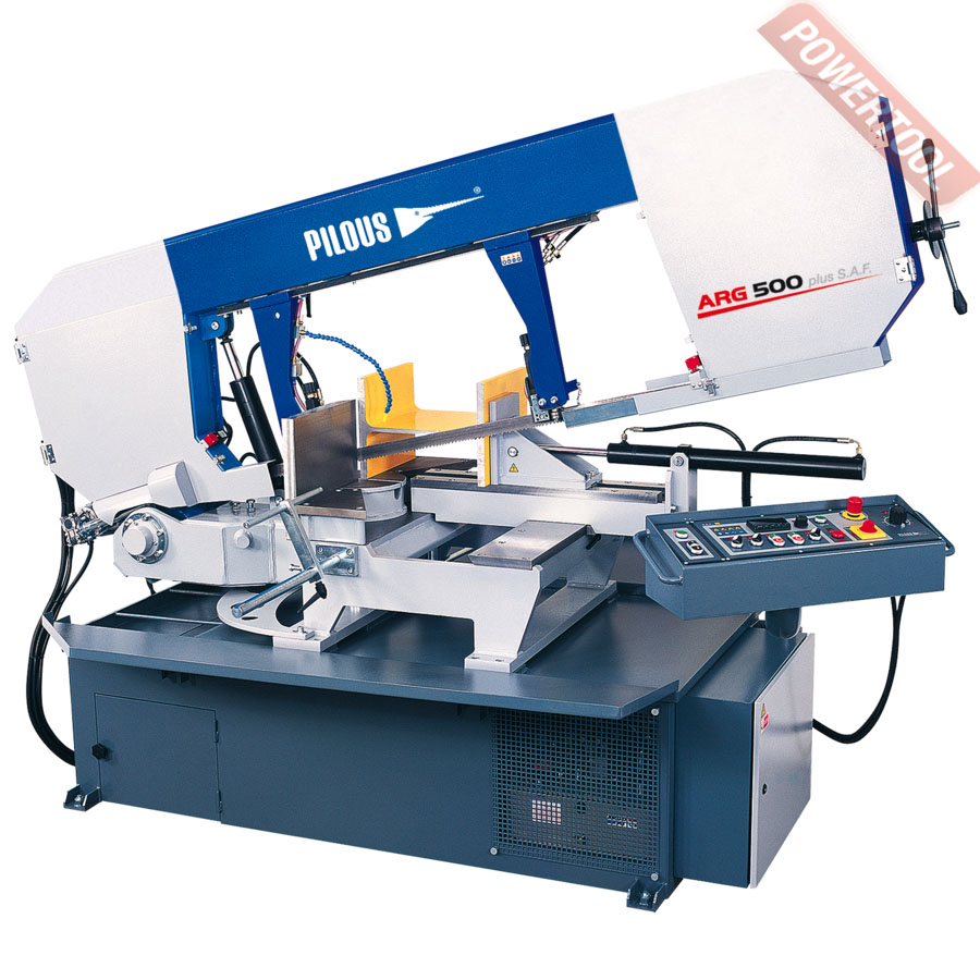 - Автоматический ленточнопильный станок. Станок оборудован высокопроизводительным промышленным гидроагрегатом. Полный цикл пиления запускается при нажатии одной кнопки - происходит зажим материала, подача заготовки в зону реза, включение вращения пилы и подачи СОЖ, распила, выключения пилы и СОЖ, подъем рамы в исходное настраиваемое положение и разжим тисков. Все это, при наличии управляемой гидравлической подачи, позволяет получить максимальную производительность, особенно при пилении больших серий и пилении труднообрабатываемых материалов сплошного сечения. При переключении в ручной режим, можно управлять всеми функциями станка по отдельности.