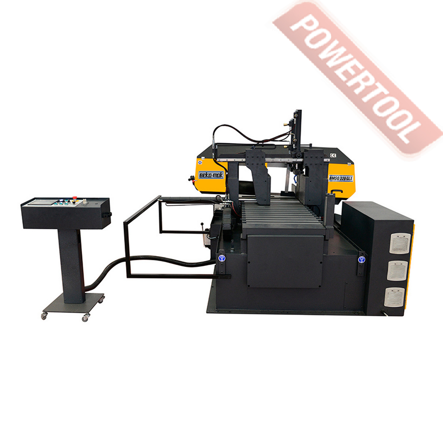 Ленточная пила по металлу STALEX BS-850G - полностью автоматический колонный станок, который является мощным оборудованием для промышленной резки в условиях серийного производства. Одностоечные ленточнопильные станки имеют 2 вертикальные стойки (колонны). Первая колонна основная большего диаметра по которой вертикально перемещается горизонтальная пильная рама, вторая колонна направляющая, данная колонна задаёт окончательное жёсткое направление рамы при работе и на холостом ходу. Пильная рама, представляет собой стальную сварную конструкцию. Режущий инструмент - бесконечная сварная ленточная пила. Полотно натягивается с помощью натяжного шкива. Натяжной шкив приводится в движение приводным шкивом, который в свою очередь, приводится через редуктор. Ленточное полотно представлено на рынке широкой номенклатурой и позволяет обрабатывать огромный спектр материалов, включая нержавеющие и инструментальные стали. На автоматических станках возможна работа как в ручном режиме, когда каждая операция выполняется вручную посредством нажатия соответствующей кнопки, так и в автоматическом режиме, когда станок выполняет весь цикл резания.