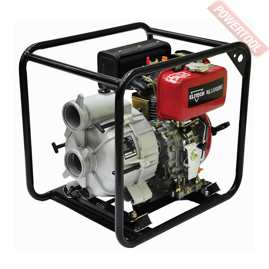 - Высоконапорная (пожарная) мотопомпа. Встретив в названии установки слово «пожарная», не спешите причислять ее к специальному оборудованию. Так изготовители обозначают бытовые помпы, развивающие высокое давление в напорной магистрали. Они предназначены не только для тушения пожаров, но и для подачи жидкости на большие расстояния. Пожарные помпы оснащают 4-х тактными бензиновыми или дизельными моторами. Производительность таких установок заметно выше, чем у низконапорных мотопомп. Она может достигать 400-600 литров в минуту при высоте подъема до 60 метров.
