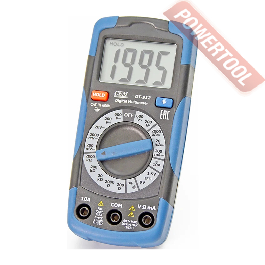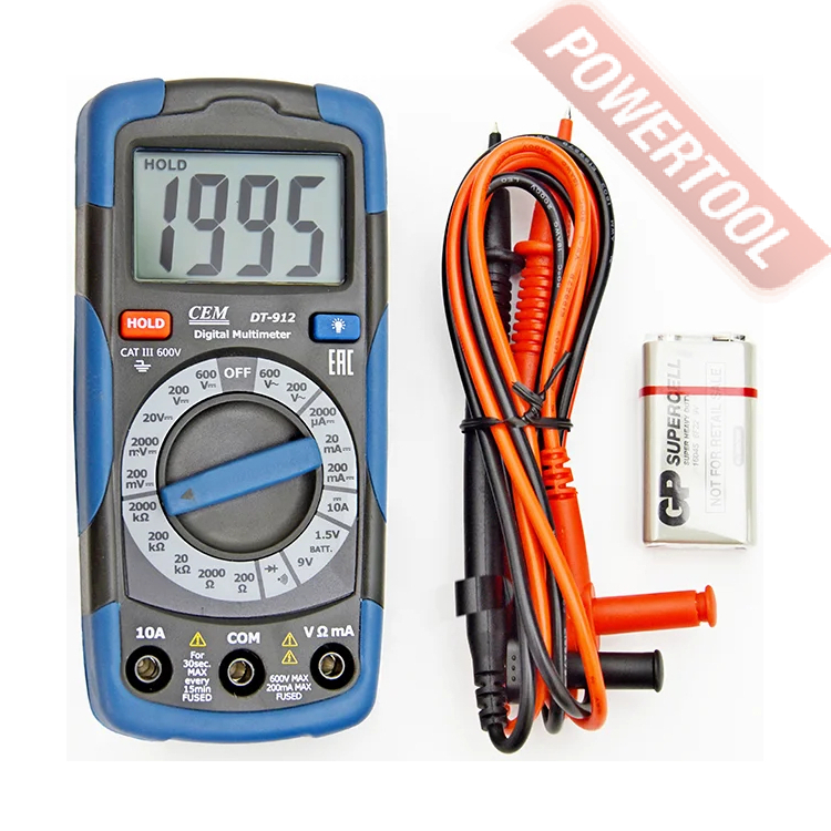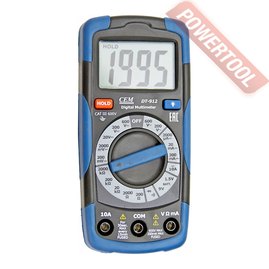Мультиметр цифровой ручной CEM DT-912 — модель эконом класса, предназначенная для измерения параметров электроцепи. Подходит для ежедневной работы с электротехникой, прозванивает цепь на целостность, осуществляет проверку диодов.
