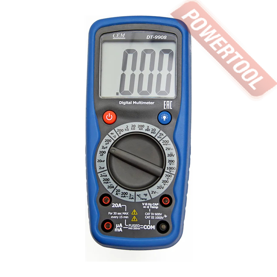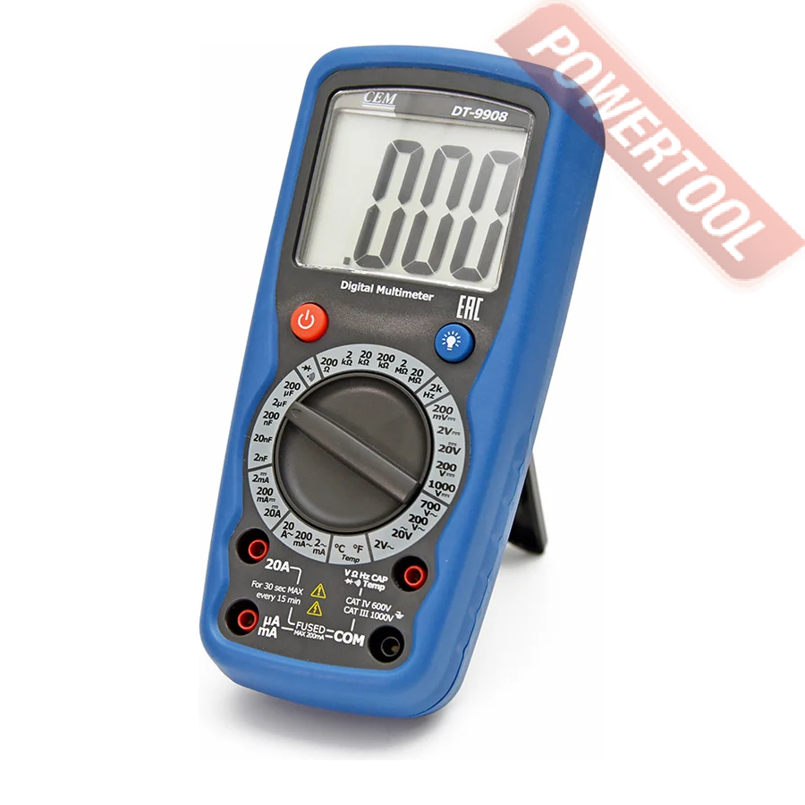 Мультиметр цифровой ручной CEM DT-9908 — прибор промышленный для проверки электрической цепи на предмет обрыва, измеряет сопротивление, силу тока и напряжение. Осуществляет тест диодов. Широкий диапазон измерений (до 1000 В, 20 А, 20 МО) расширяет функциональные возможности модели: подходит для диагностики цепей управления и их электронных компонентов, исследования силовых установок.