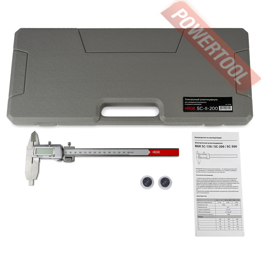 Штангенциркуль электронный RGK SC-II-200 с поверкой, где SC означает - штангенциркуль, II - второй тип, а 200 - это максимальное значение измерений в мм.