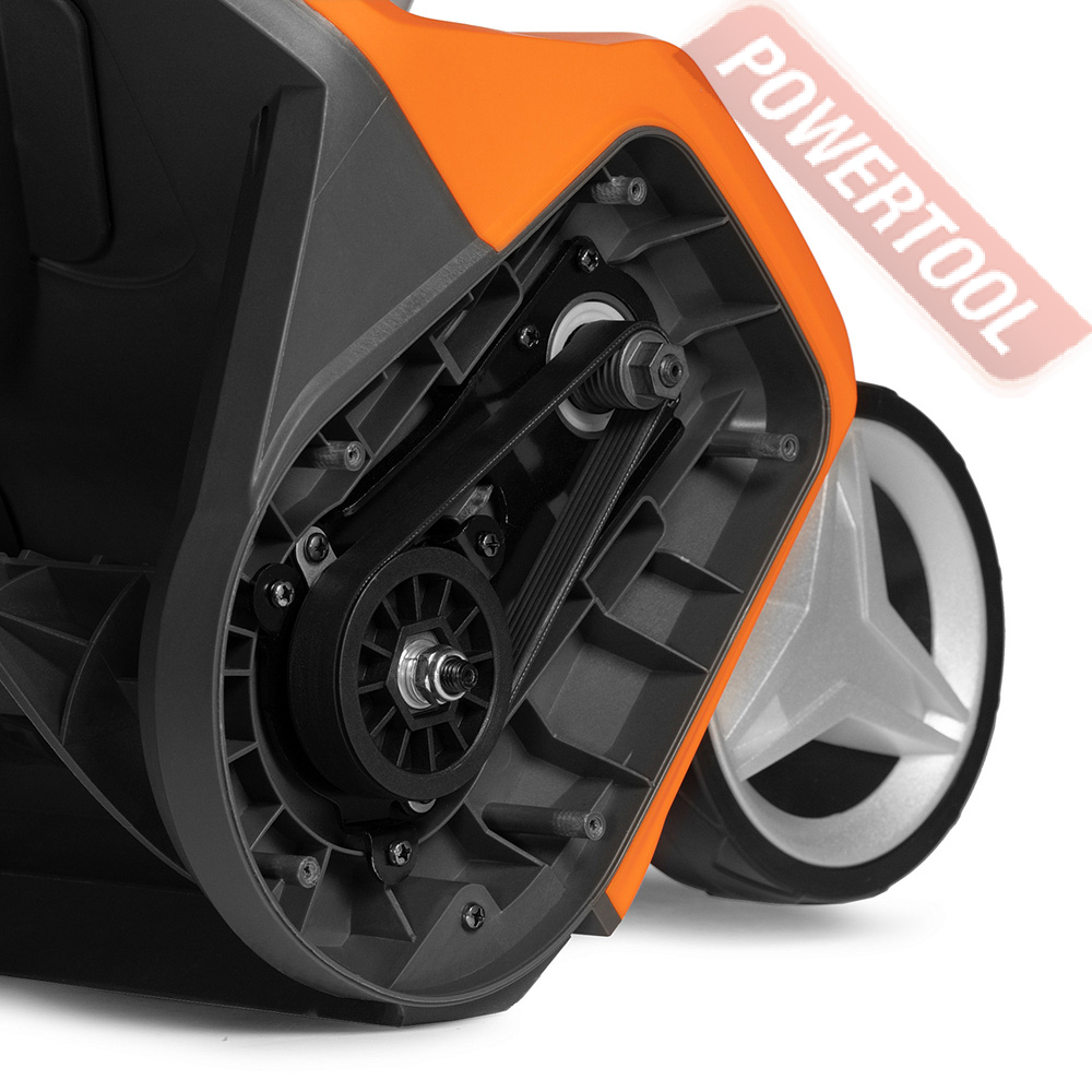 - Ременный привод обеспечивает надежную передачу крутящего момента от двигателя к шнеку, одновременно защищая мотор от перегрузок и повреждений в случае застревания или блокировки шнекового механизма.