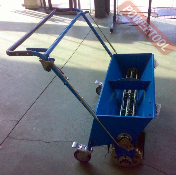 Тележка для топпинга и упрочняющей смеси, предназначена для равномерной рассыпки топпинга по поверхности свежего бетона, расход регулируется с помощью специального рычага управления расположенного на ручке тележки, вместимость бункера тележки до 100 кг. Встроенный нож для разрезания мешков. Вес тележки 40 кг.