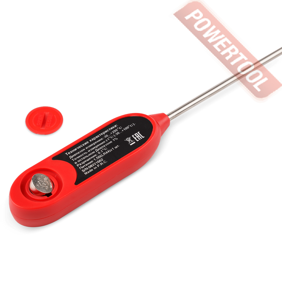 Контактный погружной пищевой термометр, диапазон измерения от -30 до 250 градусов С, погрешность 1 градус или 1 процент, температурное разрешение 0,1 градуса С, единицы измерения C/F, фиксация MIN/MAX значений температуры, зонд NTC, длина зонда 145 мм, питание от 1 батареи 3В LR44, индикатор удержания значения, габариты ДхШхВ 238х26х15 мм, вес 0,026 кг, элементы питания.